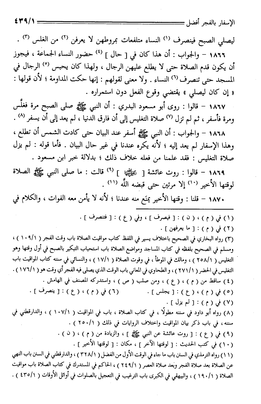1867 - قالوا: روى أبو مسعود البدري: أن النبي - صلى الله عليه وسلم - صلى الصبح مرة فغلَّس ومرة فأسفر، ثم لم تزل صلاة التغليس إلى أن فارق الدنيا، لم يعد إلى أن يسفر.