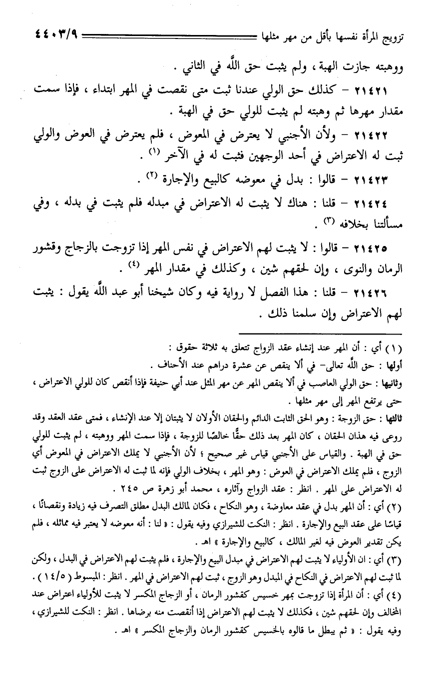 21425 - قالوا: لا يثبت لهم الاعتراض في نفس المهر إذا تزوجت بالزجاج وقشور الرمان والنوى، وإن لحقهم شين، وكذلك في مقدار المهر.
