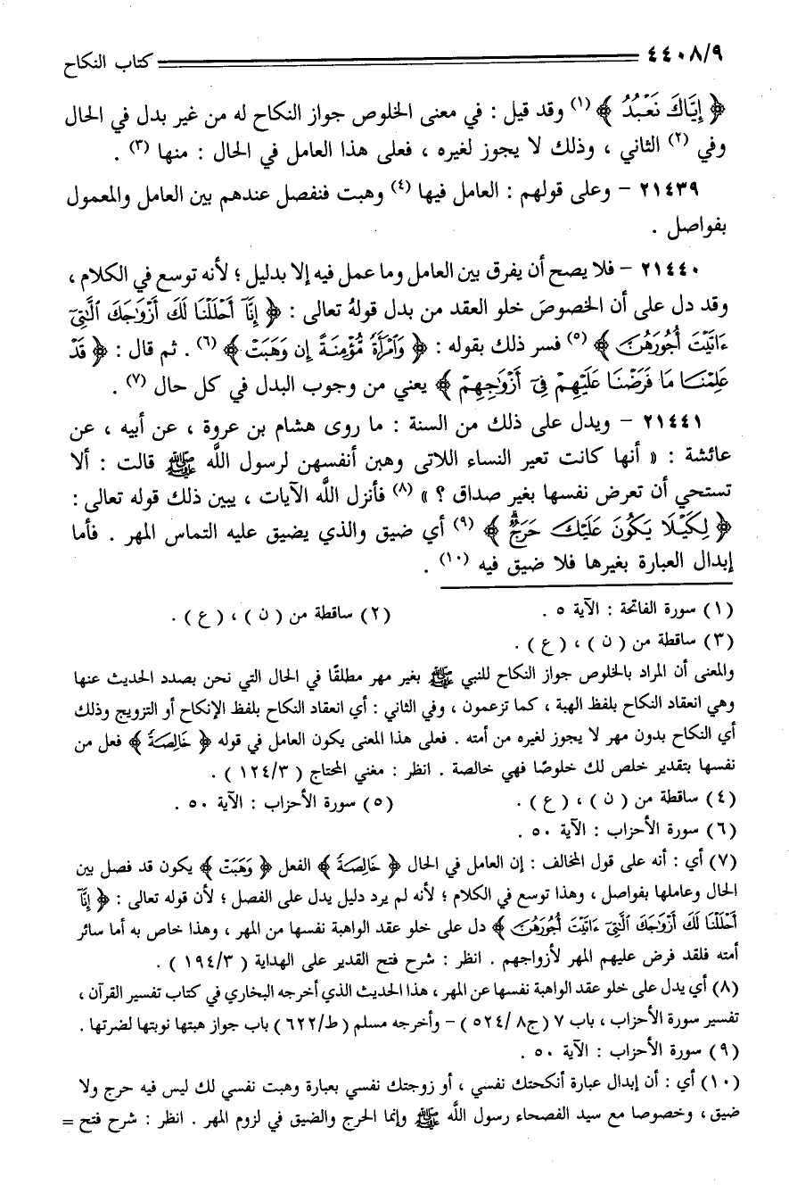 21440 - فلا يصح أن يفرق بين العامل وما عمل فيه إلا بدليل؛ لأنه توسع في الكلام، وقد دل على أن الخصوص خلو العقد من بدل قوله تعالى: {إنا أحللنا لك أزواجك التي ءاتيت أجورهن} فسر ذلك بقوله: {وامرأة مؤمنة إن وهبت}. ثم قال: {قد علمنا ما فرضنا عليهم في أزواجهم} يعني من وجوب البدل في كل حال.
