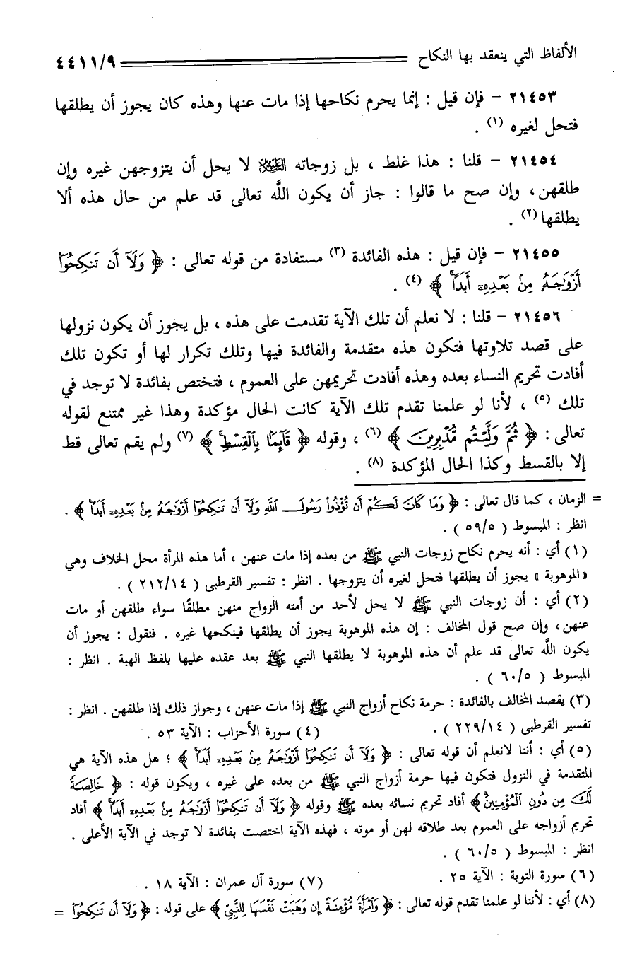 21454 - قلنا: هذا غلط، بل زوجاته - عليه السلام - لا يحل أن يتزوجهن غيره وإن طلقهن، وإن صح ما قالوا: جاز أن يكون الله تعالى قد علم من حال هذه ألا يطلقها.