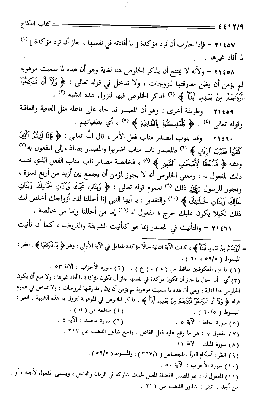21460 - وقد ينوب المصدر مناب فعل الأمر، قال الله تعالى: {فإذا لقيتم الذين كفروا فضرب الرقاب} فالمصدر ناب مناب اضربوا والمصدر يضاف إلى المفعول به ومثله {فسحقًا لأصحاب السعير}، فخالصة مصدر ناب مناب الفعل الذي نصبه ذلك المفعول به، ومعنى الخلوص أنه لا يجوز لمؤمن أن يجمع بين أزيد من أربع نسوة، ويجوز للرسول - صلى الله عليه وسلم - ذلك لعموم قوله تعالى: {وبنات عمك وبنات عماتك وبنات خالك وبنات خالاتك} والتقدير: يا أيها النبي إنا أحللنا لك أزواجك أخلص لك ذلك لكيلا يكون عليك حرج؛ مفعول له وإما من أحللنا وإما من خالصة.