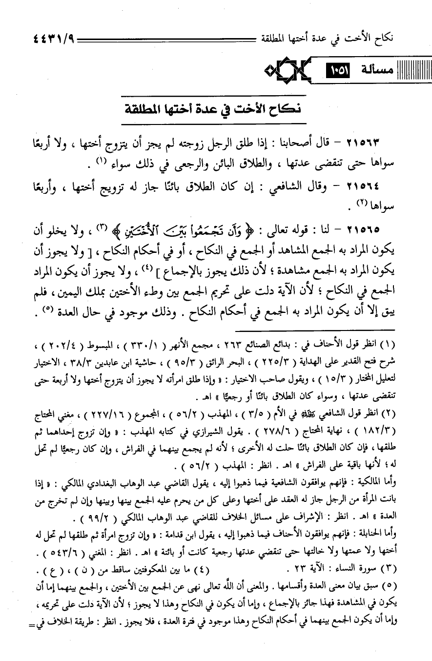 21565 - لنا: قوله تعالى: {وأن تجمعوا بين الأختين}، ولا يخلو أن يكون المراد به الجمع المشاهد أو الجمع في النكاح، أو في أحكام النكاح، [ولا يجوز أن يكون المراد به الجمع مشاهدة؛ لأن ذلك يجوز بالإجماع]، ولا يجوز أن يكون المراد الجمع في النكاح؛ لأن الآية دلت على تحريم الجمع بين وطء الأختين بملك اليمين، فلم يبق إلا أن يكون المراد به الجمع في أحكام النكاح. وذلك موجود في حال العدة.