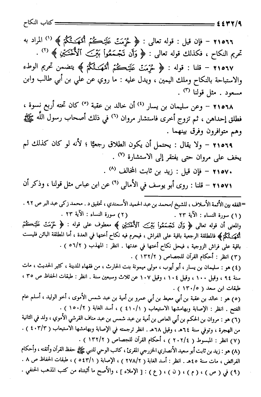 21568 - وعن سليمان بن يسار أن خالد بن عقبة كان تحته أربع نسوة، فطلق إحداهن، ثم تزوج أخرى فاستشار مروان في ذلك أصحاب رسول الله - صلى الله عليه وسلم - وهم متوافرون وفرق بينهما.