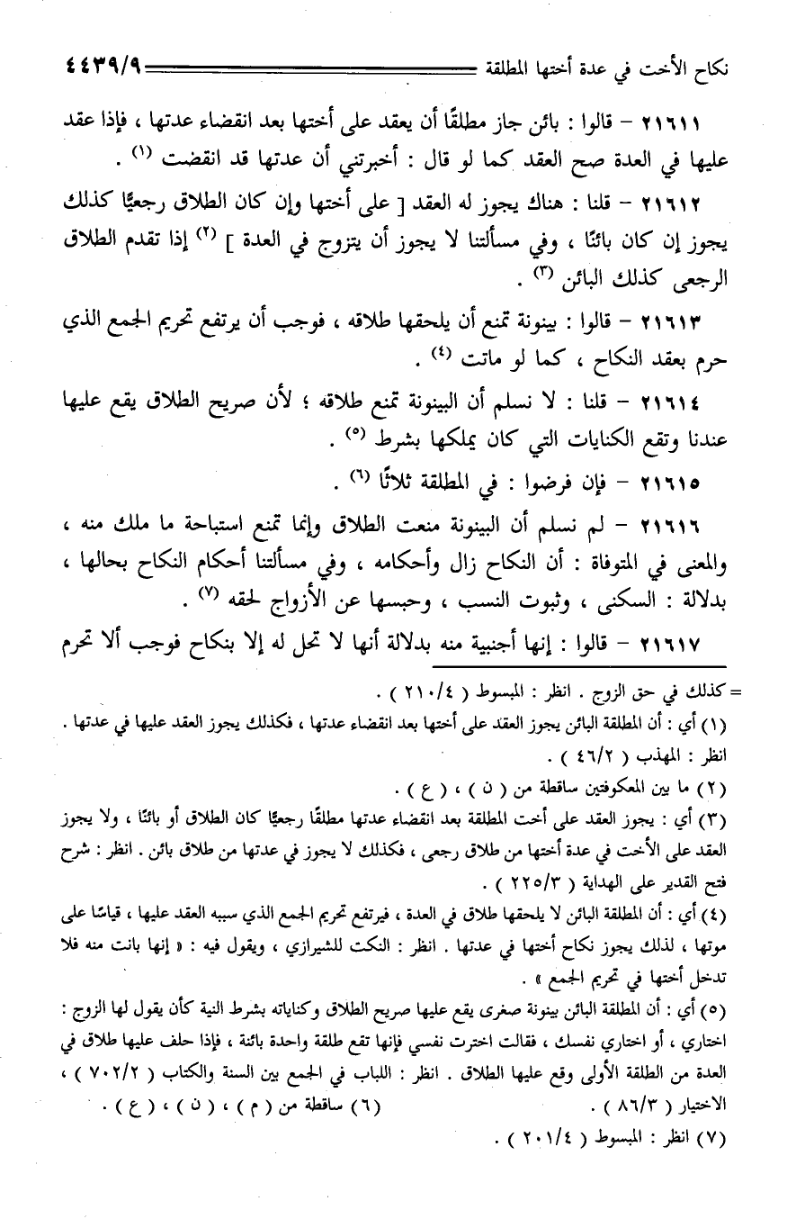 21616 - لم نسلم أن البينونة منعت الطلاق وإنما تمنع استباحة ما ملك منه، والمعنى في المتوفاة: أن النكاح زال وأحكامه، وفي مسألتنا أحكام النكاح بحالها، بدلالة: السكنى، وثبوت النسب، وحبسها عن الأزواج لحقه.