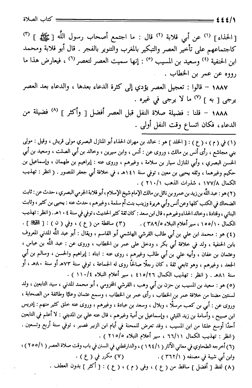 الحذاء عن أبي قلابة قال: ما اجتمع أصحاب رسول الله - صلى الله عليه وسلم - كاجتماعهم على تأخير العصر والتبكير بالمغرب والتنوير بالفجر. قال أبو قلابة ومحمد ابن الحنفية وسعيد بن المسيب: إنها سميت العصر لتعصر، فيعارض هذا ما رووه عن عمر بن الخطاب.