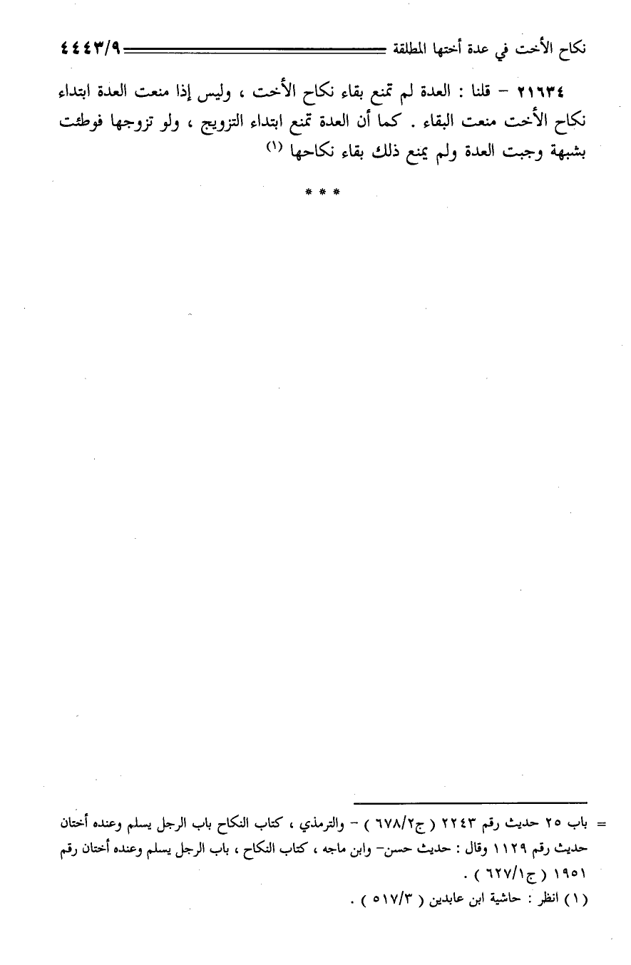 21634 - قلنا: العدة لم تمنع بقاء نكاح الأخت، وليس إذا منعت العدة ابتداء نكاح الأخت منعت البقاء. كما أن العدة تمنع ابتداء التزويج، ولو تزوجها فوطئت بشبهة وجبت العدة ولم يمنع ذلك بقاء نكاحها.