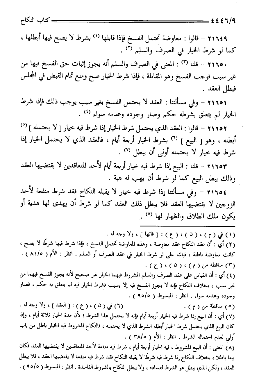 21652 - قالوا: العقد الذي يحتمل شرط الخيار إذا شرط فيه خيار [لا يحتمله] أبطله، وهو [البيع] بشرط الخيار أربعة أيام، فالعقد الذي لا يحتمل الخيار إذا شرط فيه خيار لا يحتمل أولى أن يبطل.