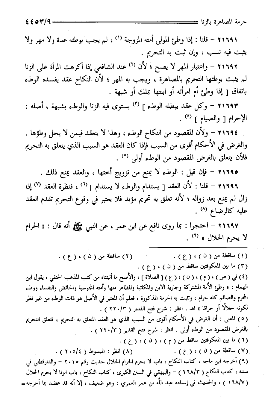 21697 - احتجوا: بما روى نافع عن ابن عمر، عن النبي - صلى الله عليه وسلم - أنه قال: (الحرام لا يحرم الحلال).