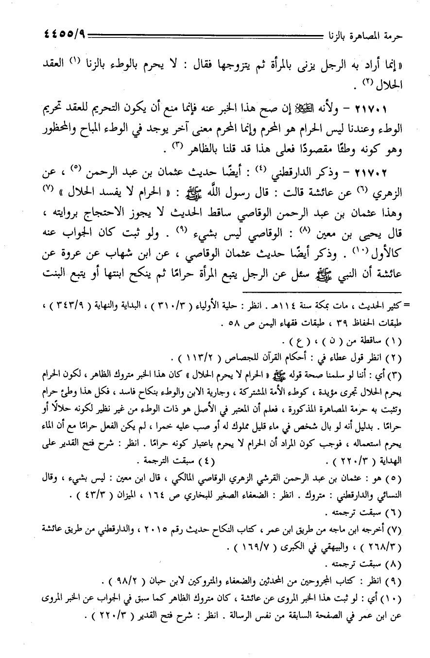 21702 - وذكر الدارقطني: أيضًا حديث عثمان بن عبد الرحمن، عن الزهري عن عائشة قالت: قال رسول الله - صلى الله عليه وسلم -: (الحرام لا يفسد الحلال) وهذا عثمان بن عبد الرحمن الوقاصي ليس بشيء. ولو ثبت كان الجواب عنه كالأول. وذكر أيضًا حديث عثمان الوقاصي، عن ابن شهاب عن عروة عن عائشة أن النبي - صلى الله عليه وسلم - سئل عن الرجل يتبع المرأة حرامًا ثم ينكح ابنتها أو يتبع البنت
