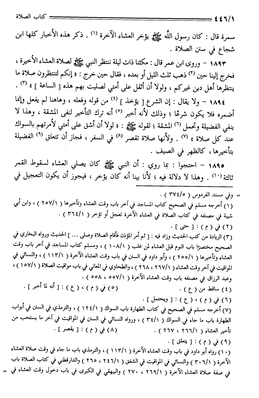 1893 - وروى ابن عمر قال: مكثنا ذات ليلة ننتظر النبي - صلى الله عليه وسلم - لصلاة العشاء الأخيرة، فخرج إلينا حين ذهب ثلث الليل أو بعده، فقال حين خرج: ((إنكم لتنتظرون صلاة ما ينتظرها أهل دين غيركم، ولولا أن أثقل على أمتي لصليت بهم هذه الساعة)).