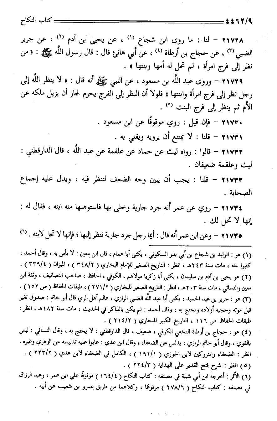 21735 - وعن ابن عمر أنه قال: أيما رجل جرد جارية فنظر إليها؛ فإنها لا تحل لابنه.