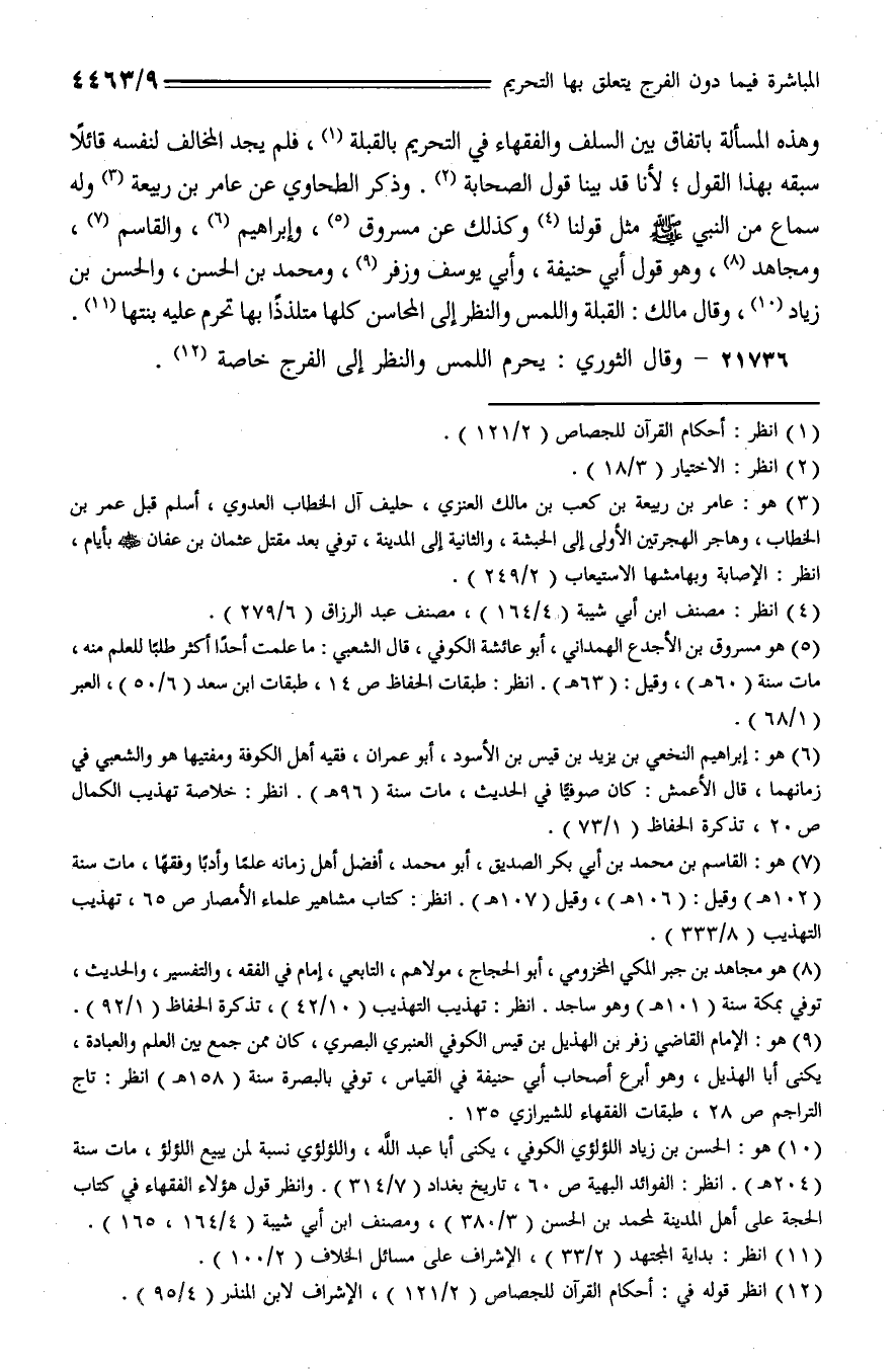 21736 - وقال الثوري: يحرم اللمس والنظر إلى الفرج خاصة.