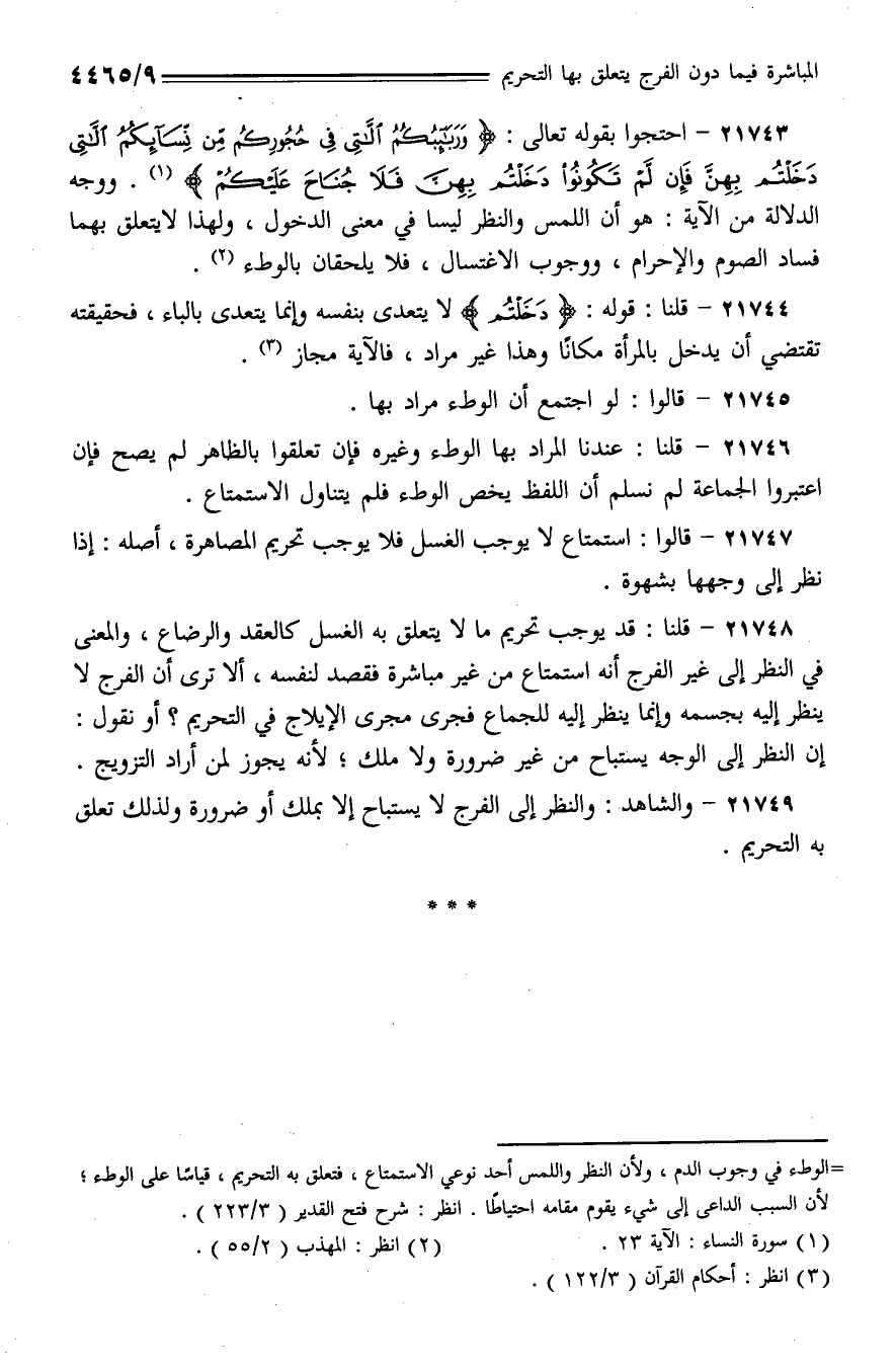 21748 - قلنا: قد يوجب تحريم ما لا يتعلق به الغسل كالعقد والرضاع، والمعنى في النظر إلى غير الفرج أنه استمتاع من غير مباشرة فقصد لنفسه، ألا ترى أن الفرج لا ينظر إليه بجسمه وإنما ينظر إليه للجماع فجرى مجرى الإيلاج في التحريم؟ أو نقول: إن النظر إلى الوجه يستباح من غير ضرورة ولا ملك؛ لأنه يجوز لمن أراد التزويج.