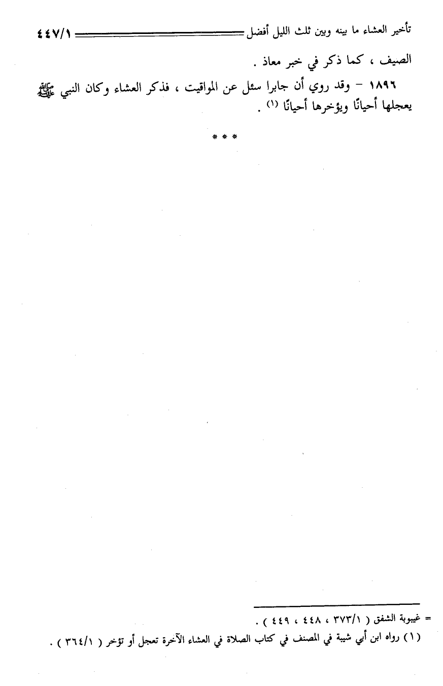 1896 - وقد روي أن جابرا سئل عن المواقيت، فذكر العشاء وكان النبي - صلى الله عليه وسلم - يعجلها أحيانًا ويؤخرها أحيانًا.