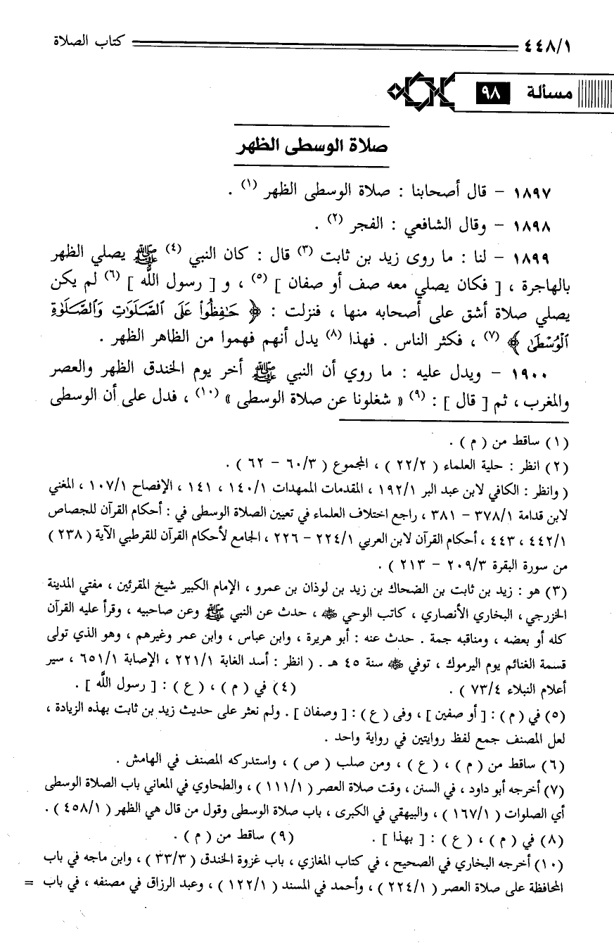 1899 - لنا: ما روى زيد بن ثابت قال: كان النبي - صلى الله عليه وسلم - يصلي الظهر بالهاجرة، فكان يصلي معه صف أو صفان، ورسول الله لم يكن يصلي صلاة أشق على أصحابه منها، فنزلت: {حافظوا على الصلوات والصلاة الوسطى}، فكثر الناس. فهذا يدل أنهم فهموا من الظاهر الظهر.