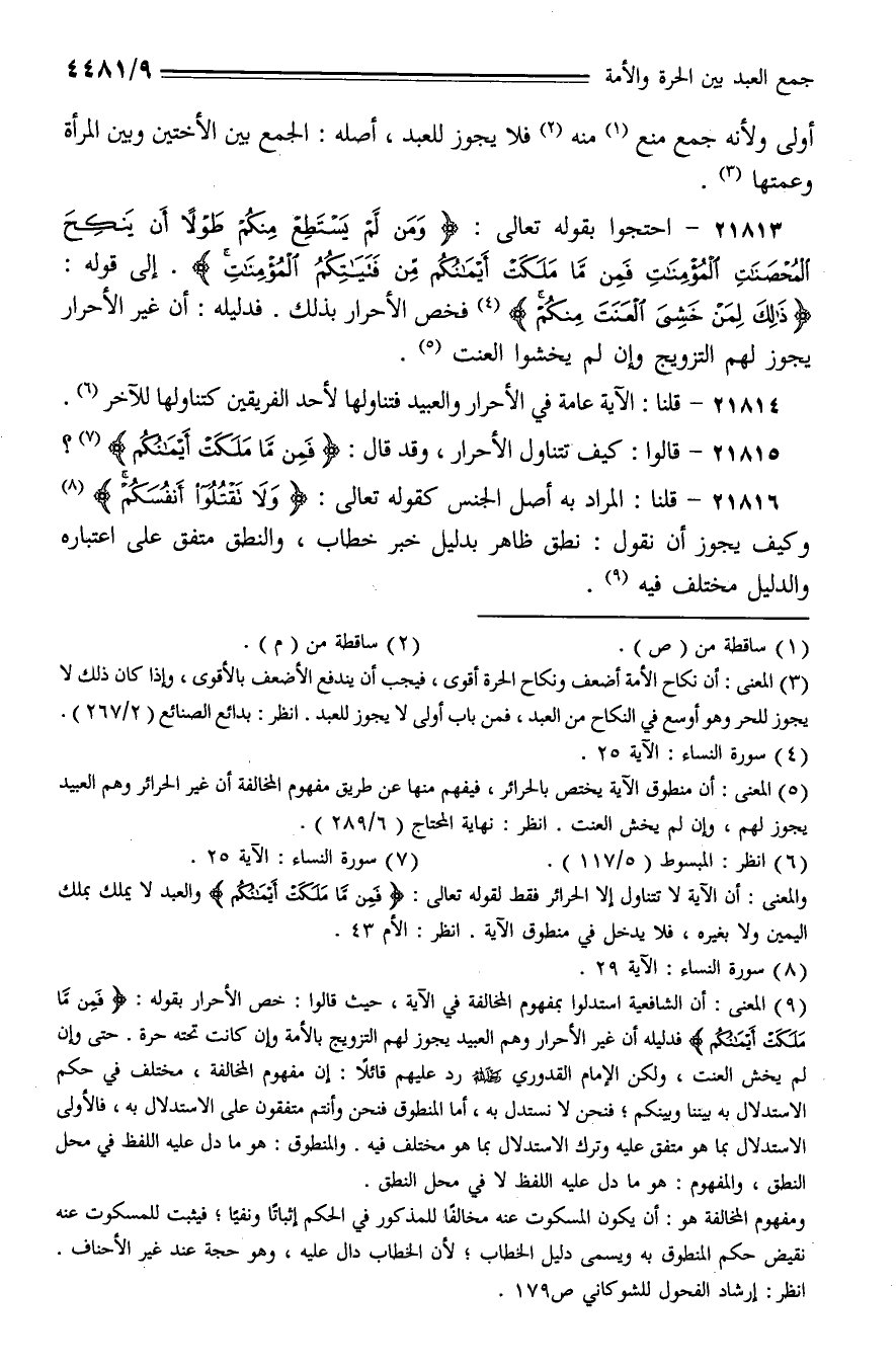 21813 - احتجوا بقوله تعالى: {ومن لم يستطع منكم طولا أن ينكح المحصنات المؤمنات فمن ما ملكت أيمانكم من فتياتكم المؤمنات}. إلى قوله: {ذلك لمن خشى العنت منكم} فخص الأحرار بذلك. فدليله: أن غير الأحرار يجوز لهم التزويج وإن لم يخشوا العنت.