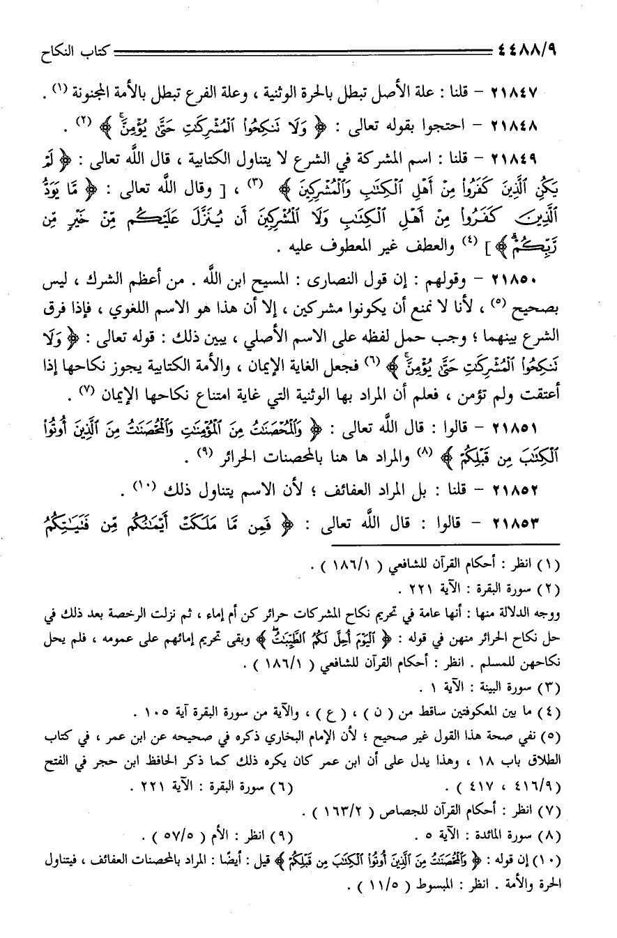 21849 - قلنا: اسم المشركة في الشرع لا يتناول الكتابية، قال الله تعالى: {لم يكن الذين كفروا من أهل الكتاب والمشركين}، [وقال الله تعالى: {ما يود الذين كفروا من أهل الكتاب ولا المشركين أن ينزل عليكم من خير من ربكم}] والعطف غير المعطوف عليه.