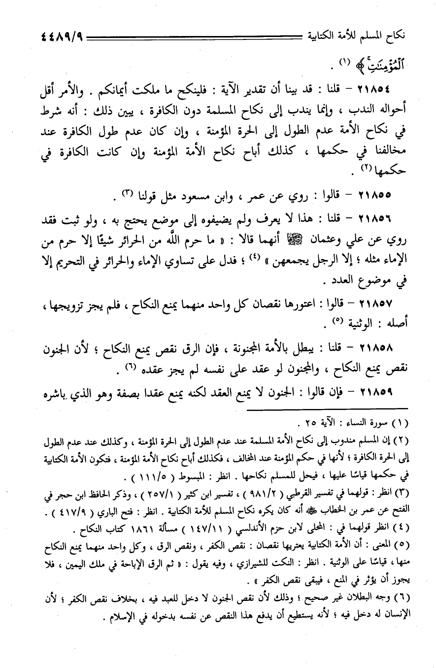 21854 - قلنا: قد بينا أن تقدير الآية: فلينكح ما ملكت أيمانكم. والأمر أقل أحواله الندب، وإنما يندب إلى نكاح المسلمة دون الكافرة، يبين ذلك: أن شرط في نكاح الأمة عدم الطول إلى الحرة المؤمنة، وإن كان عدم طول الكافرة عند مخالفنا في حكمها، كذلك أباح نكاح الأمة المؤمنة وإن كانت الكافرة في حكمها.