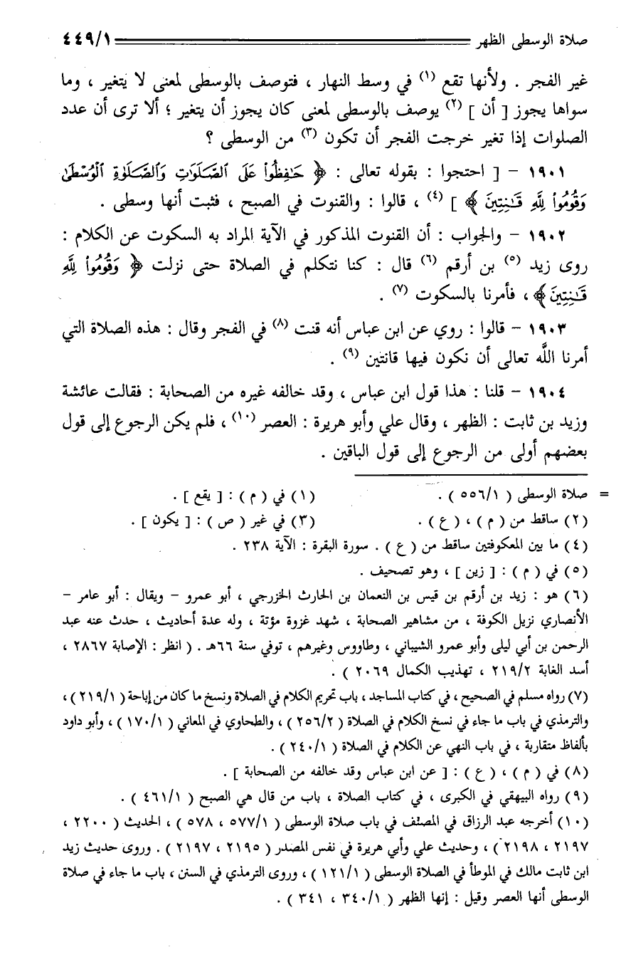 1901 - احتجوا: بقوله تعالى: {حافظوا على الصلوات والصلاة الوسطى وقوموا لله قانتين}، قالوا: والقنوت في الصبح، فثبت أنها وسطى.