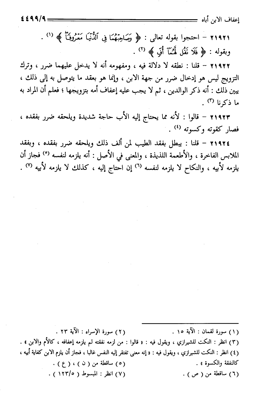 21922 - قلنا: نطقه لا دلالة فيه، ومفهومه أنه لا يدخل عليهما ضرر، وترك التزويج ليس هو إدخال ضرر من جهة الابن، وإنما هو بعقد ما يتوصل به إلى ذلك، يبين ذلك: أنه ذكر الوالدين، ثم لا يجب عليه إعفاف أمة بتزويجها؛ فعلم أن المراد به ما ذكرنا.
