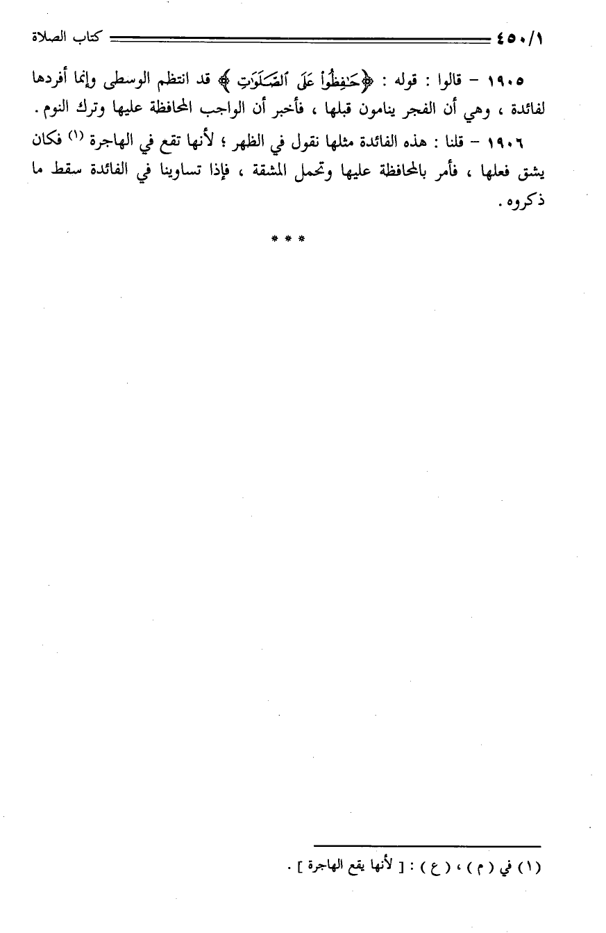1906 - قلنا: هذه الفائدة مثلها نقول في الظهر؛ لأنها تقع في الهاجرة فكان يشق فعلها، فأمر بالمحافظة عليها وتحمل المشقة، فإذا تساوينا في الفائدة سقط ما ذكروه.