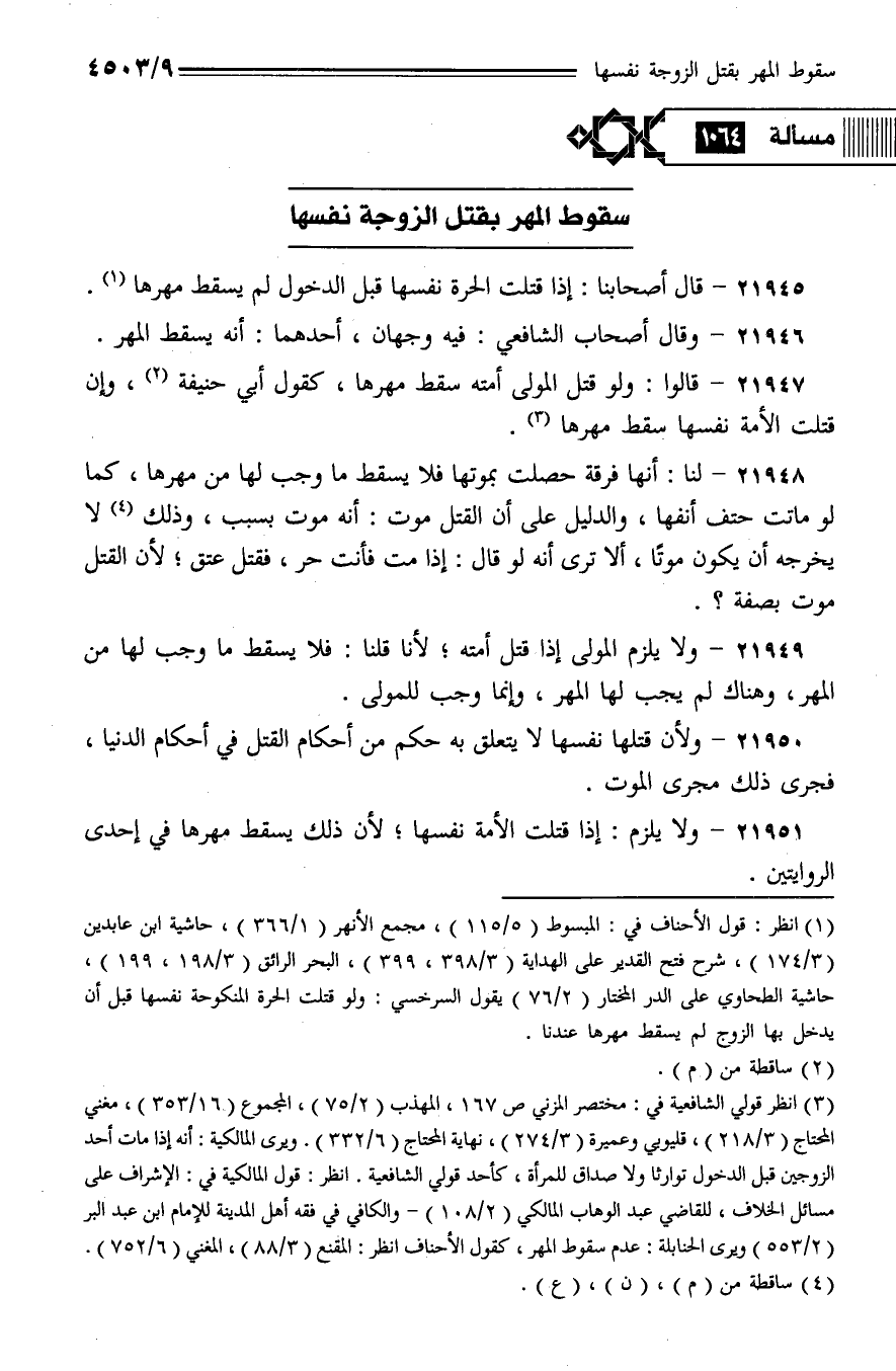 21951 - ولا يلزم: إذا قتلت الأمة نفسها؛ لأن ذلك يسقط مهرها في إحدى الروايتين.