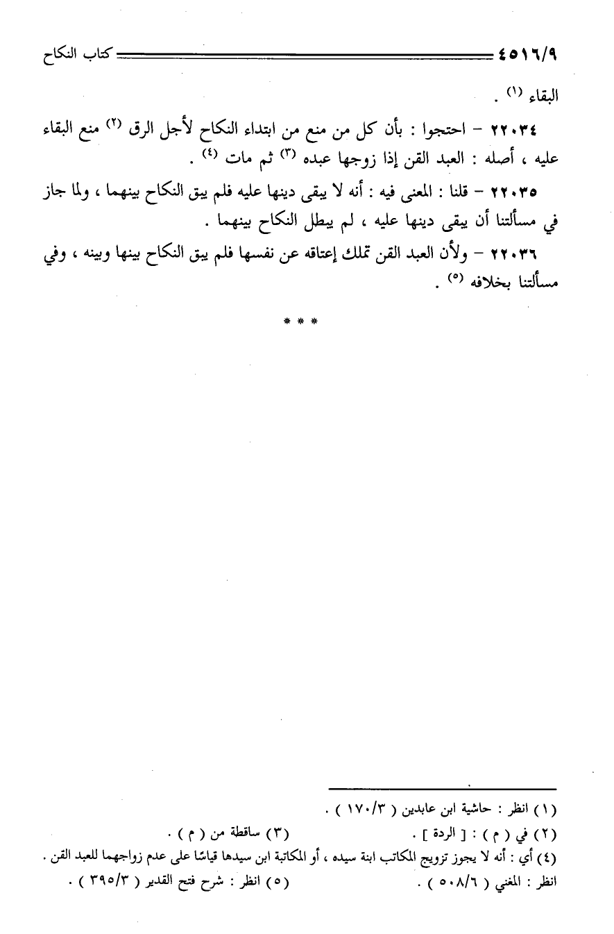 22034 - احتجوا: بأن كل من منع من ابتداء النكاح لأجل الرق منع البقاء عليه، أصله: العبد القن إذا زوجها عبده ثم مات.
