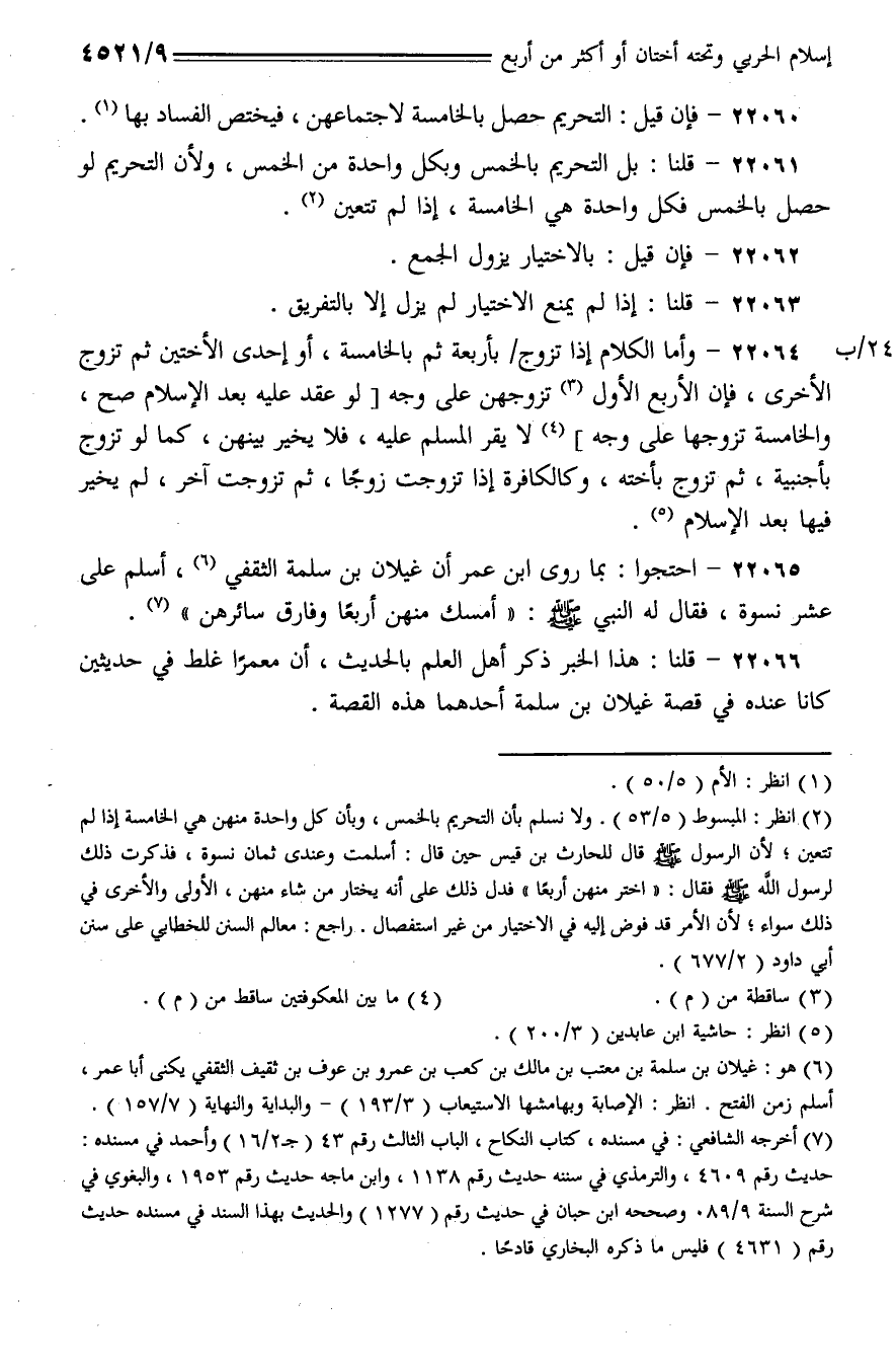 22065 - احتجوا: بما روى ابن عمر أن غيلان بن سلمة الثقفي، أسلم على عشر نسوة، فقال له النبي - صلى الله عليه وسلم -: (أمسك منهم أربعًا وفارق سائرهن).