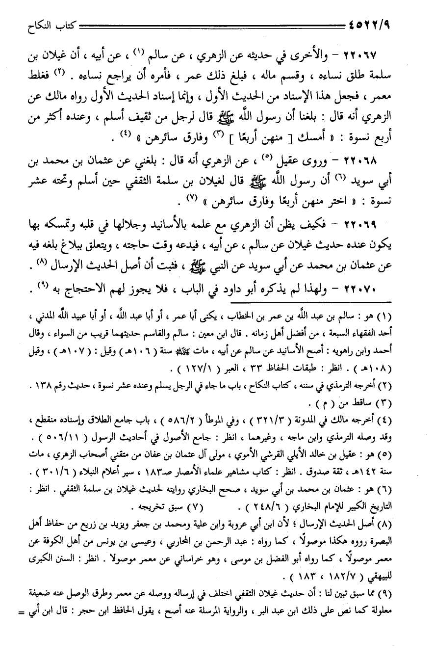 22068 - وروى عقيل، عن الزهري أنه قال: بلغني عن عثمان بن محمد بن أبي سويد أن رسول الله - صلى الله عليه وسلم - قال لغيلان بن سلمة الثقفي حين أسلم وتحته عشر نسوة: (اختر منهن أربعًا وفارق سائرهن).