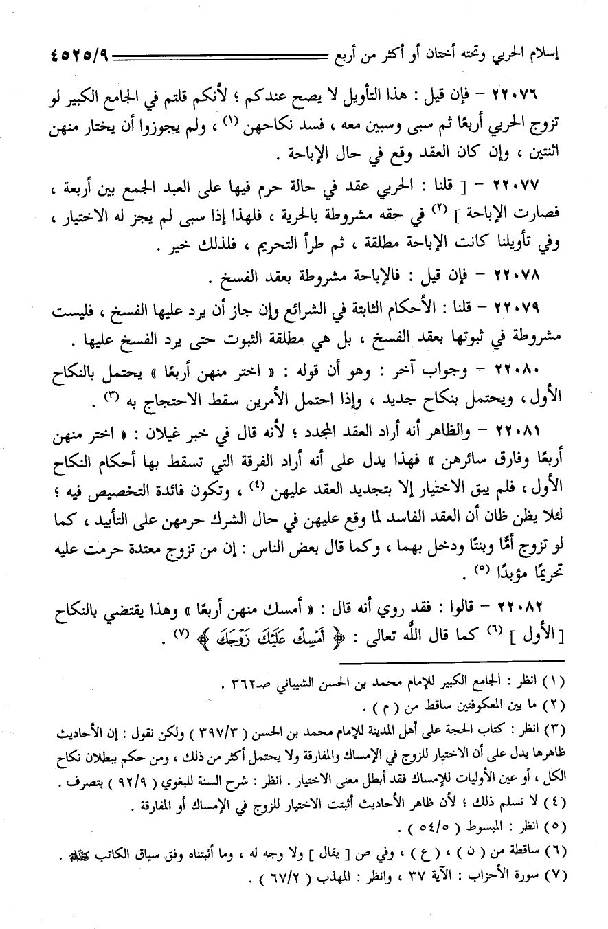 22076 - فإن قيل: هذا التأويل لا يصح عندكم؛ لأنكم قلتم في الجامع الكبير لو تزوج الحربي أربعًا ثم سبى وسبين معه، فسد نكاحهن، ولم يجوزوا أن يختار منهن اثنتين، وإن كان العقد وقع في حال الإباحة.
