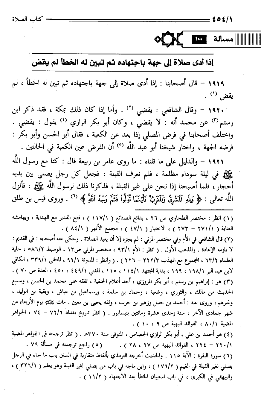1919 - قال أصحابنا: إذا أدى صلاة إلى جهة باجتهاده ثم تبين له الخطأ، لم يقض.