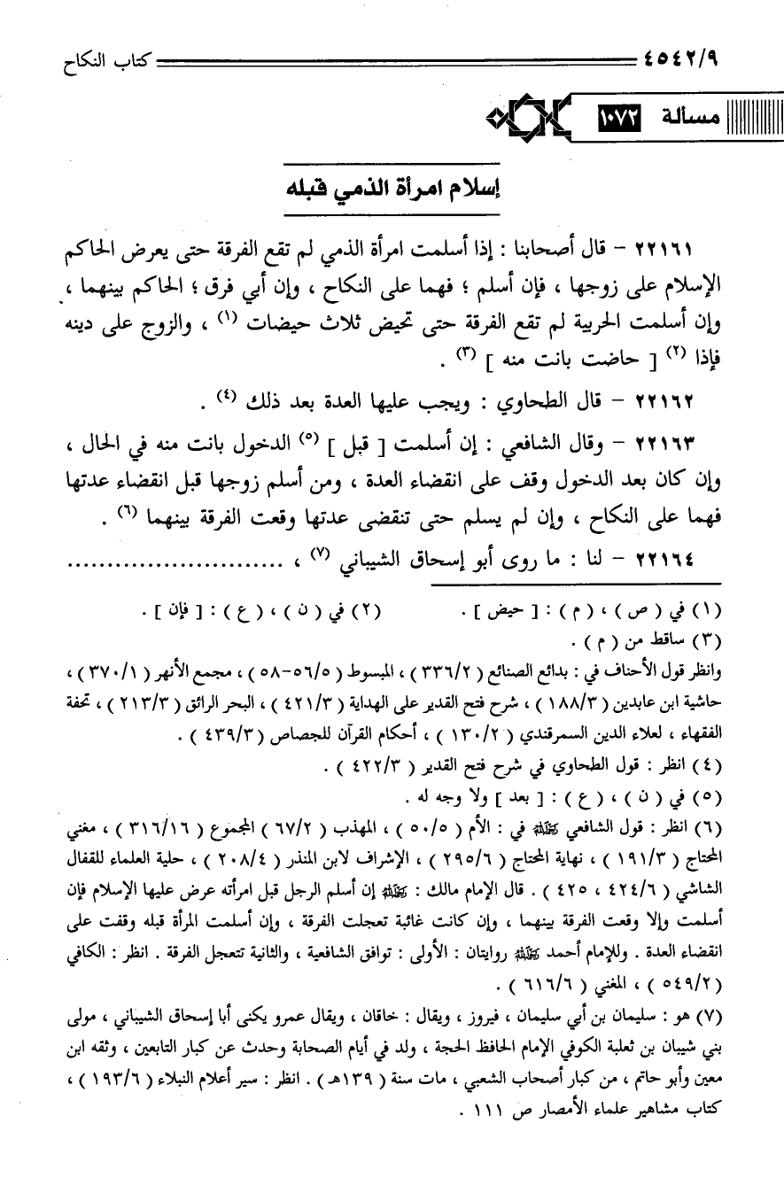 22161 - قال أصحابنا: إذا أسلمت امرأة الذمي لم تقع الفرقة حتى يعرض الحاكم الإسلام على زوجها، فإن أسلم؛ فهما على النكاح، وإن أبي فرق؛ الحاكم بينهما، وإن أسلمت الحربية لم تقع الفرقة حتى تحيض ثلاث حيضات، والزوج على دينه فإذا [حاضت بانت منه].