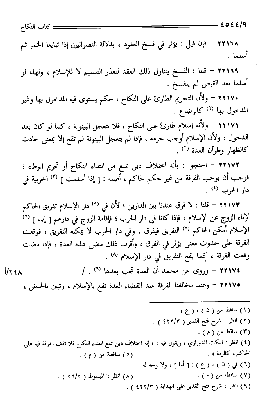 22172 - احتجوا: بأنه اختلاف دين يمنع من ابتداء النكاح أو تحريم الوطء؛ فوجب أن يوجب الفرقة من غير حكم حاكم، أصله: [إذا أسلمت] الحربية في دار الحرب.