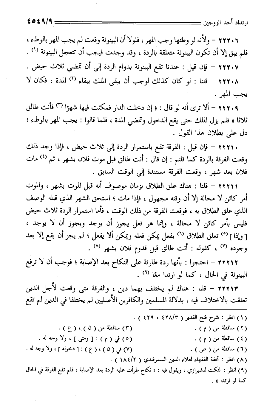 22206 - ولأنه لو وطئها وجب المهر، فلولا أن البينونة وقعت لم يجب المهر بالوطء، فلم يبق إلا أن تكون البينونة متعلقة بالردة، وقد وجدت فيجب أن تتعجل البينونة.