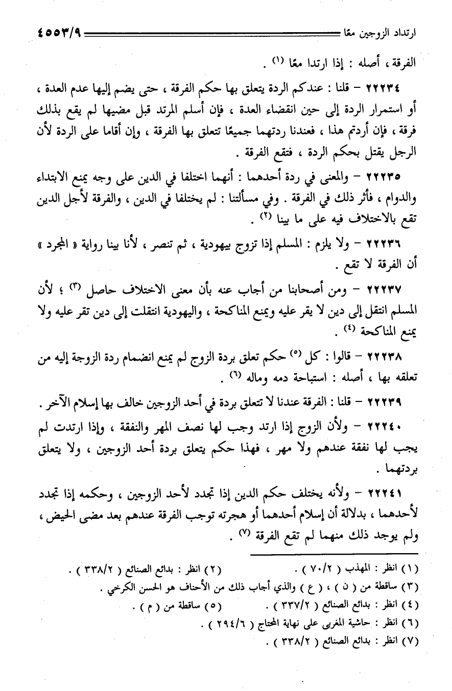 22234 - قلنا: عندكم الردة يتعلق بها حكم الفرقة، حتى يضم إليها عدم العدة، أو استمرار الردة إلى حين انقضاء العدة، فإن أسلم المرتد قبل مضيها لم يقع بذلك الفرقة، فإن أردتم هذا، فعندنا ردتهما جميعًا تتعلق بها الفرقة، وإن أقاما على الردة لأن الرجل يقتل بحكم الردة، فتقع الفرقة.