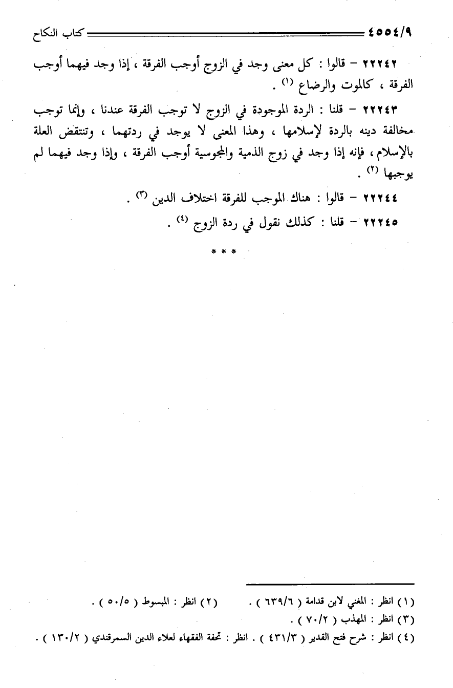 22243 - قلنا: الردة الموجودة في الزوج لا توجب الفرقة عندنا، وإنما توجب مخالفة دينه بالردة لإسلامها، وهذا المعنى لا يوجد في ردتهما، وتنقض العلة بالإسلام، فإنه إذا وجد في زوج الذمية والمجوسية أوجب الفرقة، وإذا وجد فيهما لم يوجبها.