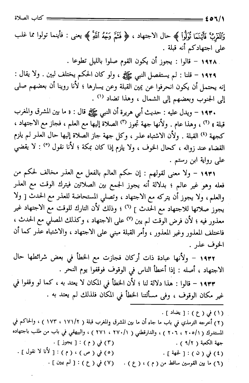 1932 - ولأنها عبادة ذات أركان فجازت مع الخطأ في بعض شرائطها حال الاجتهاد، أصله: إذا أخطأ الناس في الوقوف فوقفوا يوم النحر.