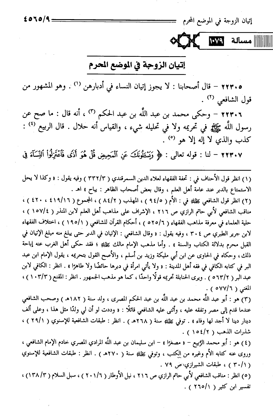 22305 - قال أصحابنا: لا يجوز إتيان النساء في أدبارهن. وهو المشهور من قول الشافعي.