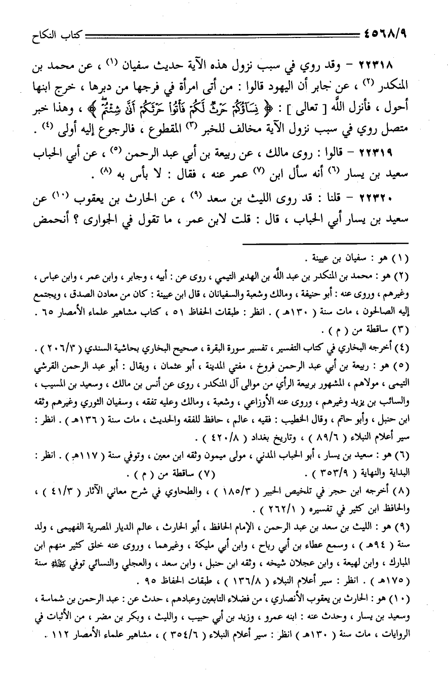 22318 - وقد روي في سبب نزول هذه الآية حديث سفيان، عن محمد بن النكدر، عن جابر أن اليهود قالوا: من أتى امرأة في فرجها من دبرها، خرج ابنها أحول، فأنزل الله [تعالى]: {نساؤكم حرث لكم فأتوا حرثكم أنى شئتم}، وهذا خبر متصل روي في سبب نزول الآية مخالف للخبر المقطوع، فالرجوع إليه أولى.