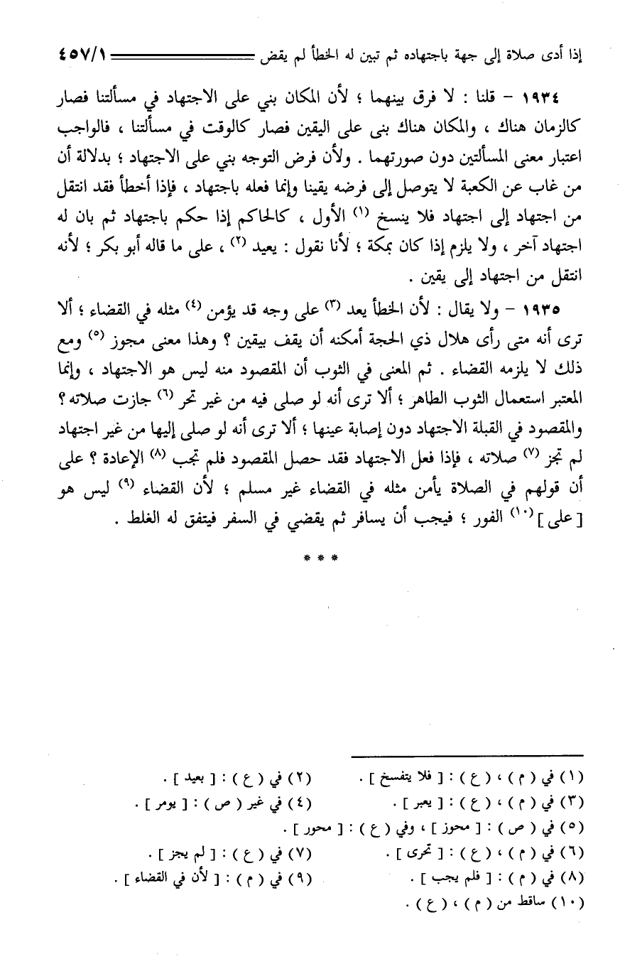 1935 - ولا يقال: لأن الخطأ يعد على وجه قد يؤمن مثله في القضاء؛ ألا ترى أنه متى رأى هلال ذي الحجة أمكنه أن يقف بيقين؟ وهذا معنى مجوز ومع ذلك لا يلزمه القضاء. ثم المعنى في الثوب أن المقصود منه ليس هو الاجتهاد، وإنما المعتبر استعمال الثوب الطاهر؛ ألا ترى أنه لو صلى فيه من غير تحر جازت صلاته؟ والمقصود في القبلة الاجتهاد دون إصابة عينها؛ ألا ترى أنه لو صلى إليها من غير اجتهاد لم تجز صلاته، فإذا فعل الاجتهاد فقد حصل المقصود فلم تجب الإعادة؟ على أن قولهم في الصلاة يأمن مثله في القضاء غير مسلم؛ لأن القضاء ليس هو على الفور؛ فيجب أن يسافر ثم يقضي في السفر فيتفق له الغلط.