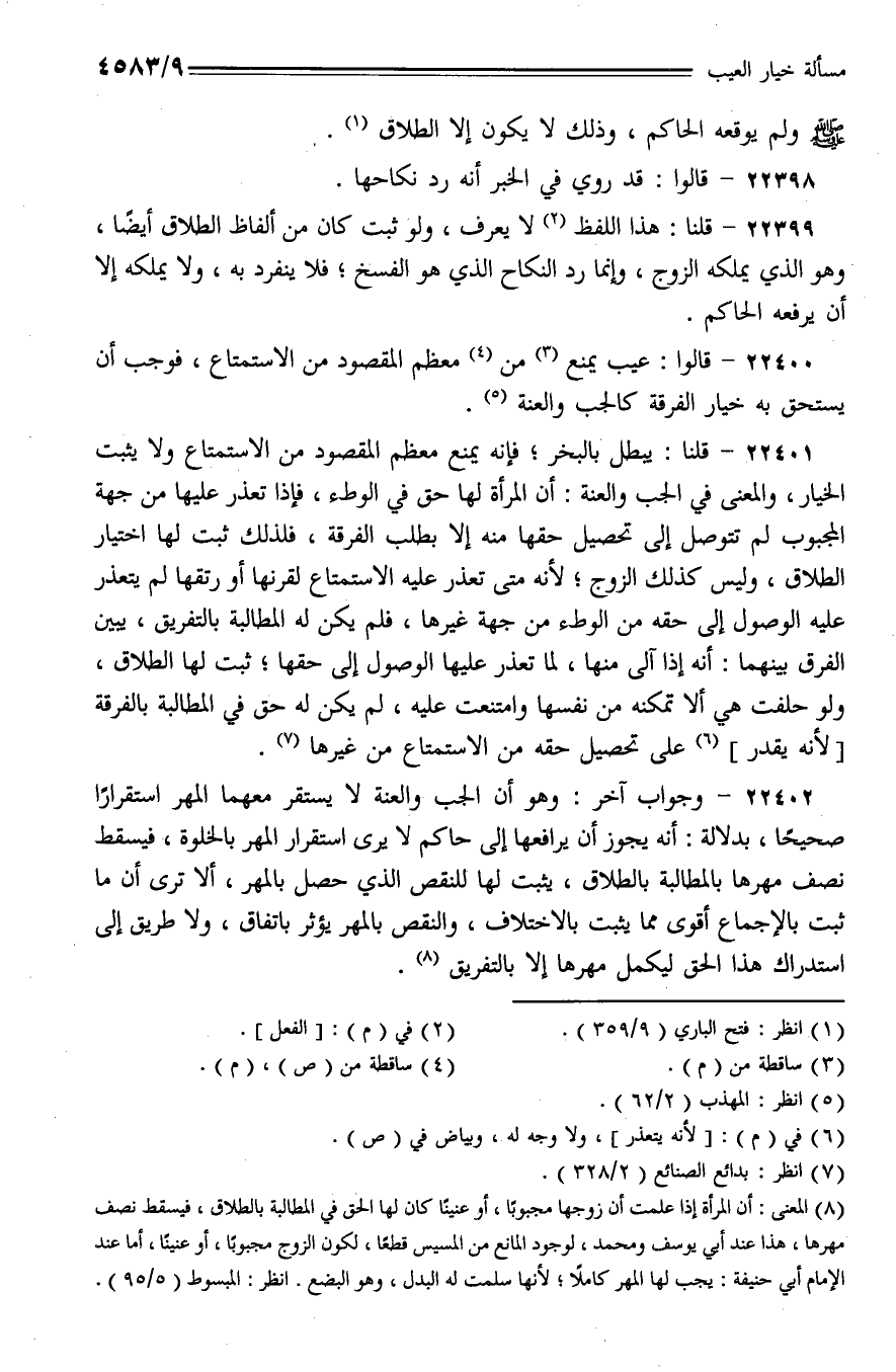 22400 - قالوا: عيب يمنع من معظم المقصود من الاستمتاع، فوجب أن يستحق به خيار الفرقة كالجب والعنة.