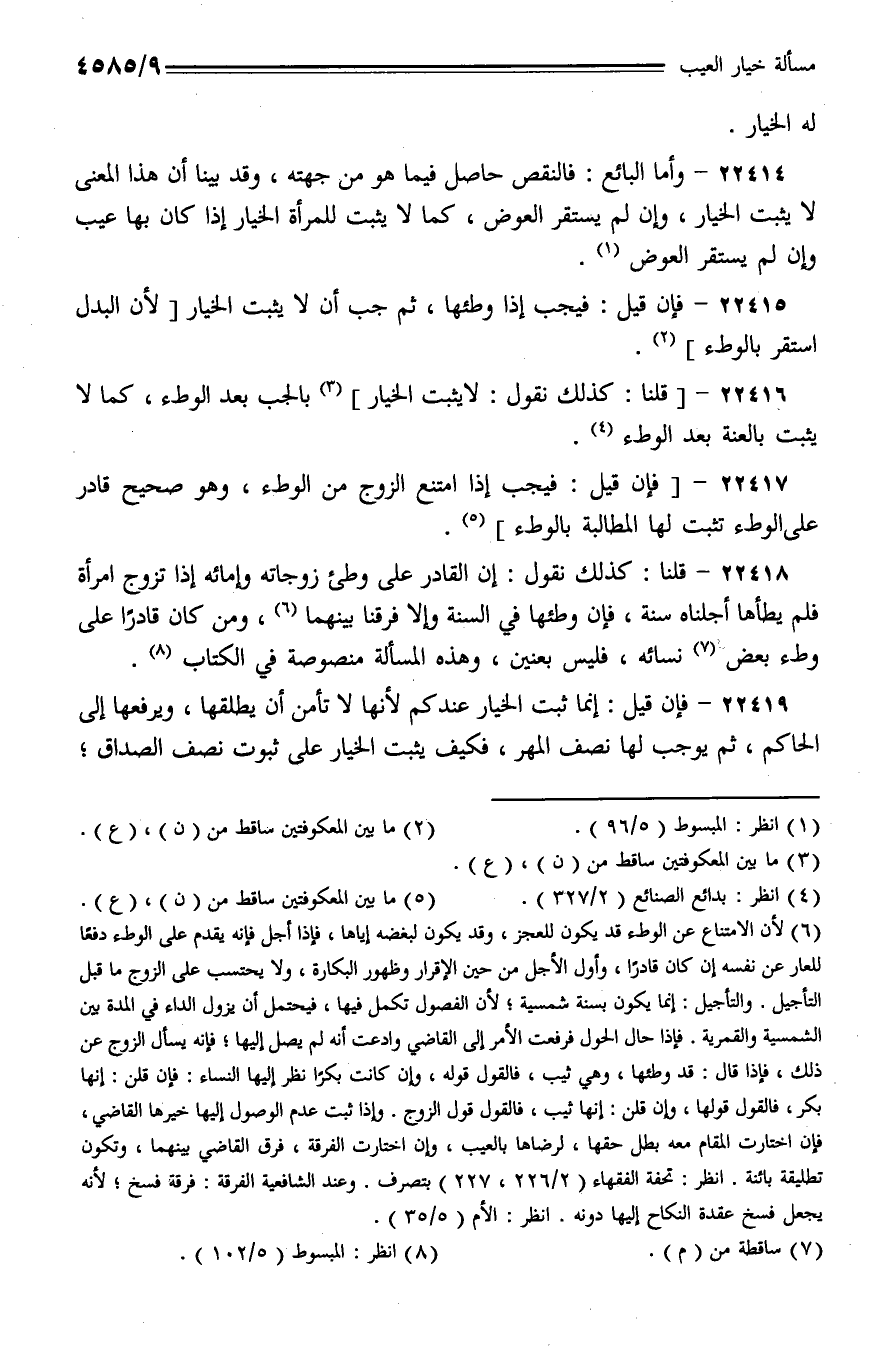 22414 - وأما البائع: فالنقص حاصل فيما هو من جهته، وقد بينا أن هذا المعنى لا يثبت الخيار، وإن لم يستقر العوض، كما لا يثبت للمرأة الخيار إذا كان بها عيب وإن لم يستقر العوض.