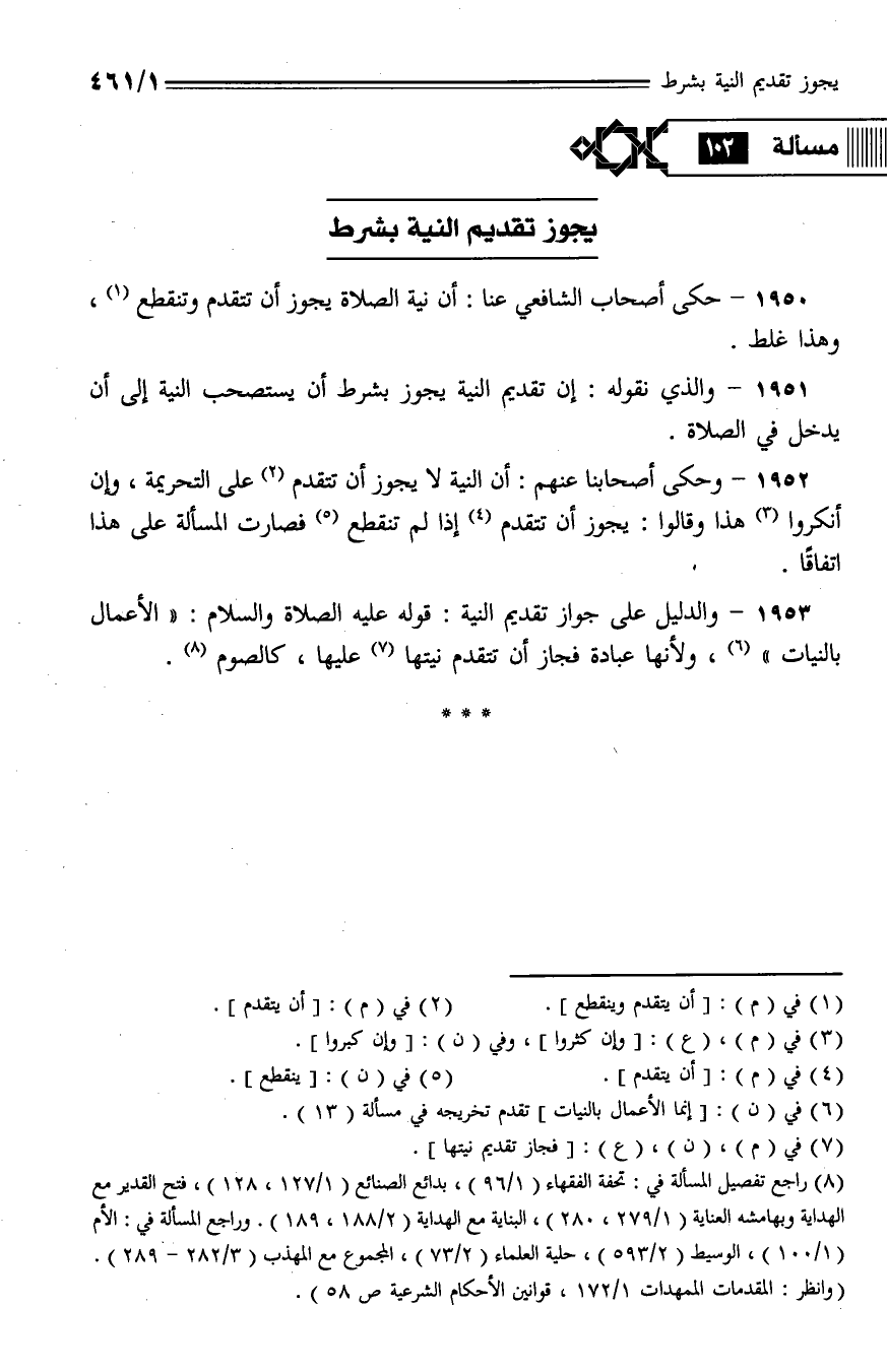 1951 - والذي نقوله: إن تقديم النية يجوز بشرط أن يستصحب النية إلى أن يدخل في الصلاة.