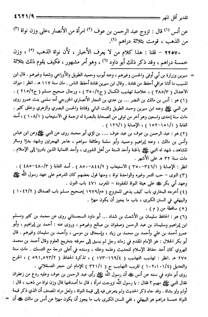عن أنس قال: تزوج عبد الرحمن بن عوف امرأة من الأنصار، على وزن نواة من الذهب، قومت بثلاثة دراهم.