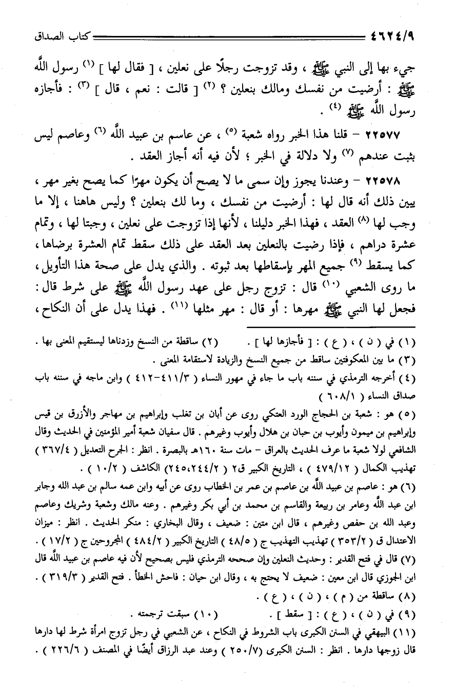 22578 - وعندنا يجوز وإن سمى ما لا يصح أن يكون مهرًا كما يصح بغير مهر، يبين ذلك أنه قال لها: أرضيت من نفسك، وما لك بنعلين؟ وليس هاهنا، إلا ما وجب لها العقد، فهذا الخبر دليلنا، لأنها إذا تزوجت على نعلين، وجبتها لها، وتمام عشرة دراهم، فإذا رضيت بالنعلين بعد العقد على ذلك سقط تمام العشرة برضاها، كما يسقط جميع المهر بإسقاطها بعد ثبوته. والذي يدل على صحة هذا التأويل، ما روى الشعبي قال: تزوج رجل على عهد رسول الله - صلى الله عليه وسلم - على شرط قال: فجعل لها النبي - صلى الله عليه وسلم - مهرها: أو قال: مهر مثلها. فهذا يدل على أن النكاح،