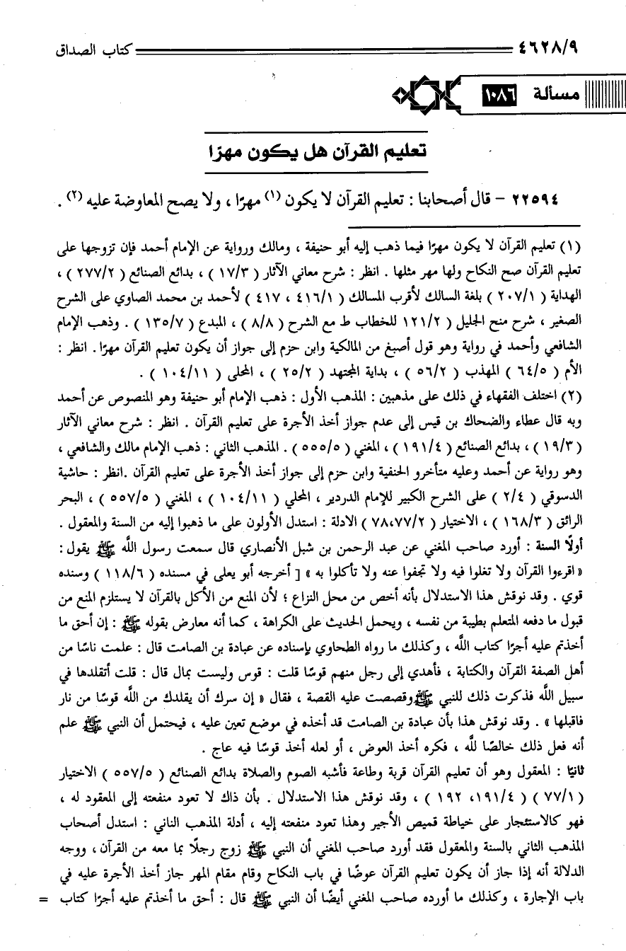 22594 - قال أصحابنا: تعليم القرآن لا يكون مهرًا، ولا يصح المعاوضة عليه.