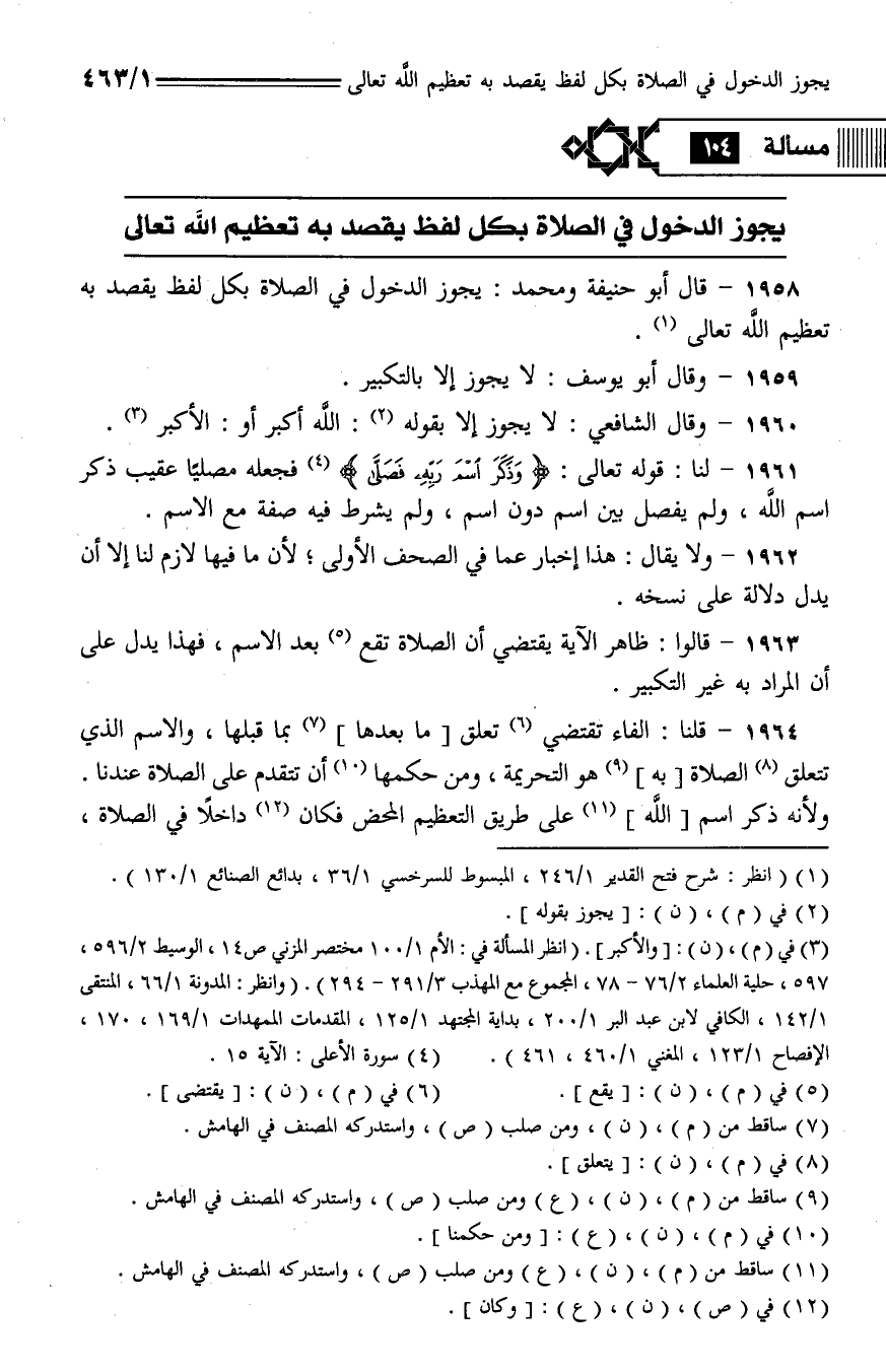 1964 - قلنا: الفاء تقتضي تعلق ما بعدها بما قبلها، والاسم الذي تتعلق الصلاة به هو التحريمة، ومن حكمها أن تتقدم على الصلاة عندنا. ولأنه ذكر اسم الله على طريق التعظيم المحض فكان داخلًا في الصلاة،