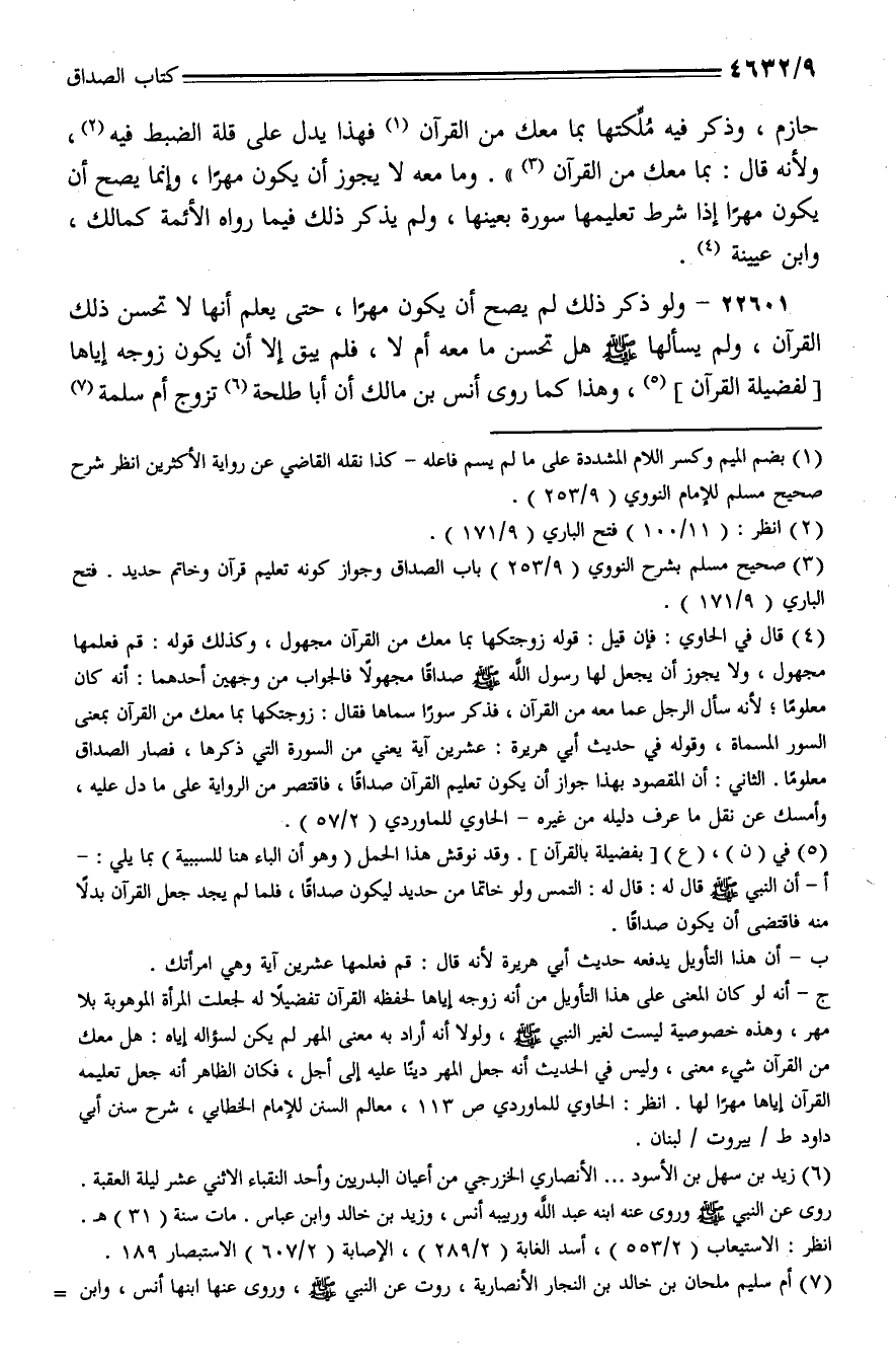 22601 - ولو ذكر ذلك لم يصح أن يكون مهرًا، حتى يعلم أنها لا تحسن ذلك القرآن، ولم يسألها - صلى الله عليه وسلم - هل تحسن ما معه أم لا، فلم يبق إلا أن يكون زوجه إياها [لفضيلة القرآن]، وهذا كما روى أنس بن ملك أن أبا طلحة تزوج أم سلمة