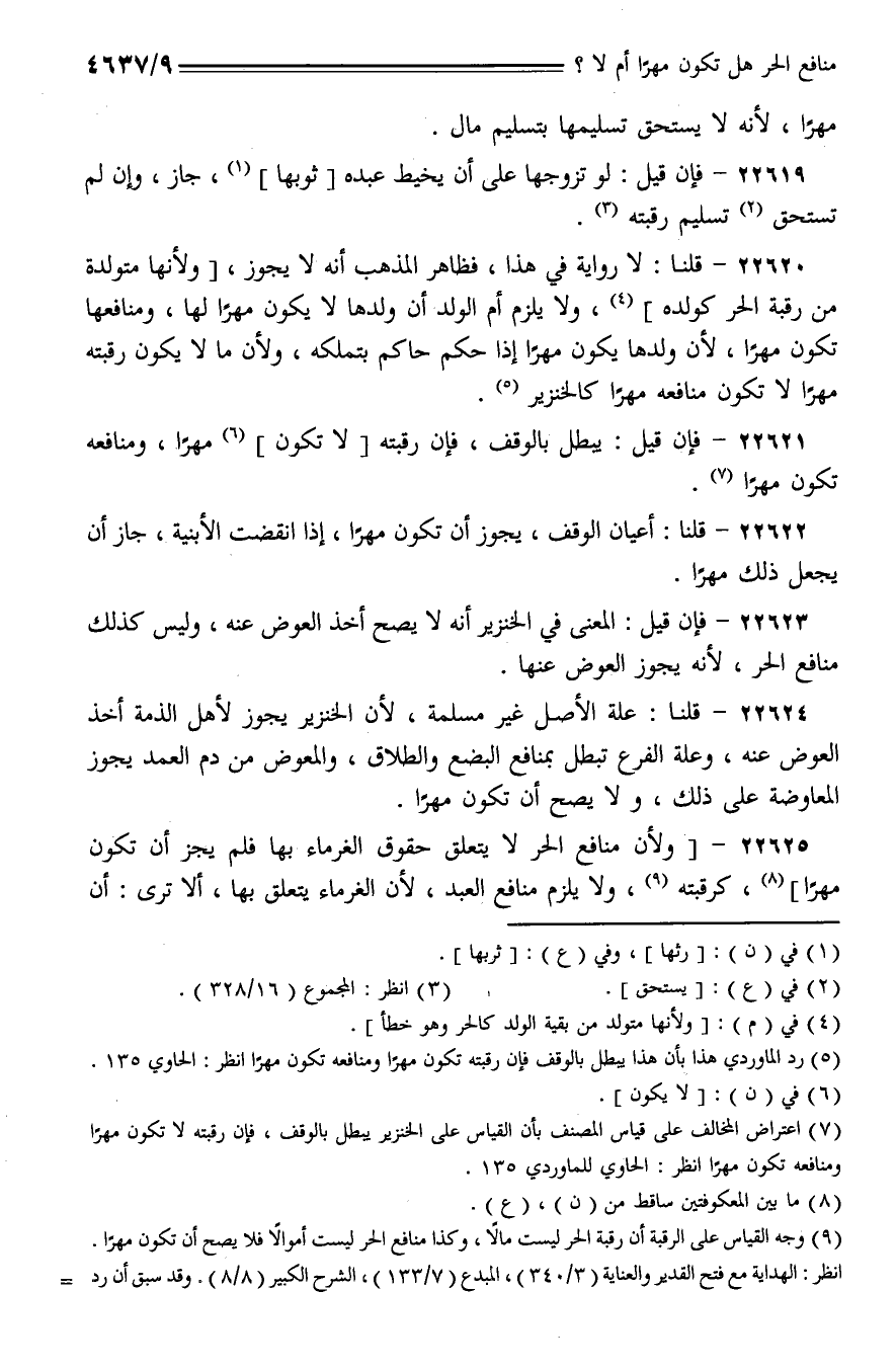 22625 - [ولأن منافع الحر لا يتعلق حقوق الغرماء بها فلم يجز أن تكون مهرًا]، كرقبته، ولا يلزم منافع العبد، لأن الغرماء يتعلق بها، ألا ترى: أن
