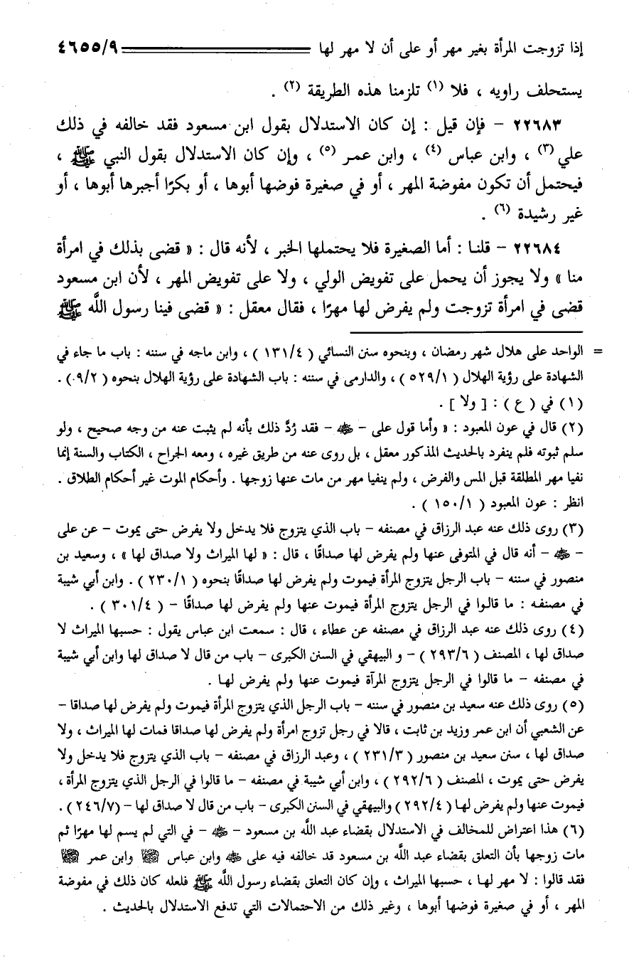 22683 - فإن قيل: إن كان الاستدلال بقول ابن مسعود فقد خالفه في ذلك علي، وابن عباس، وابن عمر، وإن كان الاستدلال بقول النبي - صلى الله عليه وسلم -، فيحتمل أن تكون مفوضة المهر، أو في صغيرة فوضها أبوها، أو بكرًا أجبرها أبوها، أو غير رشيدة.